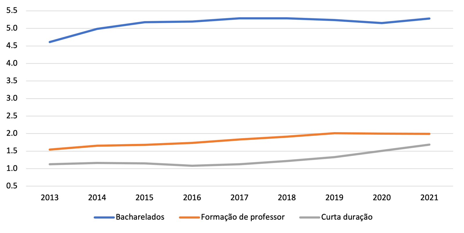 Essas matrículas estão principalmente alocadas nos cursos bacharelados tradicionais (Administração, Direito, Engenharia, Medicina etc.), com 5 milhões das matrículas, em um total de 9 (59%). Todavia, tem se observado uma queda nessa proporção, que já foi de 65% em 2015. Já os cursos de curta duração, majoritariamente os Cursos Superiores de Tecnologia, têm aumentado essa proporção, indo de 14% em 2015 para 19% em 2021 (Figura 2).