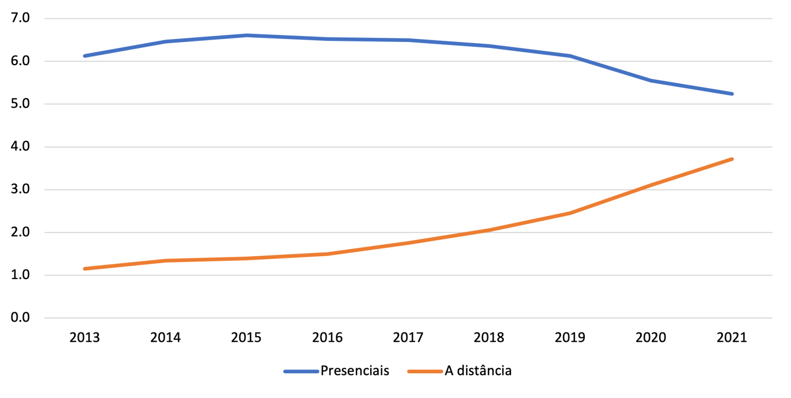 Figura 4 - Evolução das matrículas no ensino superior no Brasil, conforme a modalidade de oferta, em milhões (fonte: INEP)