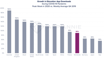 De aplicativos organizacionais e de produtividade, como o Blackboard, até aos que promovem um aprendizado mais baseado em competências para o trabalho, como o DuoLingo, estão sendo utilizados como nunca antes na história. Globalmente, observa-se que os downloads de aplicativos utilizados em educação tiveram um pico em março de 2020, aumentando em 90% se comparado com a média semanal do quarto trimestre de 2019. Um detalhe importante é que a geração Z se envolveu 55% a mais no uso de aplicativos educacionais, o que antes já utilizavam para jogos e outros interesses. Nos EUA, observa-se um crescimento de 135% como demonstrado no gráfico abaixo.
