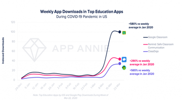 Este estudo aponta os três principais aplicativos educacionais com mais downloads nos EUA após a semana de 22 de março de 2020. Entre eles o Google Classroom , Remind (um aplicativo para Android e iOS que oferece um ambiente de interação para professores se relacionarem com os alunos e os pais) e ClassDojo , que pontuaram respectivamente uma a 580%, 290% e 565% de crescimento, respectivamente, em comparação com a média semanal em janeiro de 2020. Vejam no gráfico abaixo.
