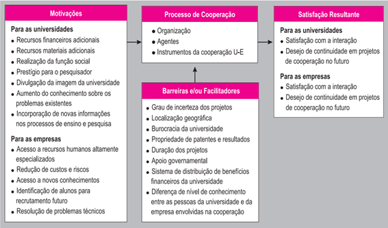 Fatores como barreiras ou facilitadores do processo de cooperação são apresentados na figura abaixo de forma resumida, bem como a satisfação resultante entre os atores destas parcerias.
