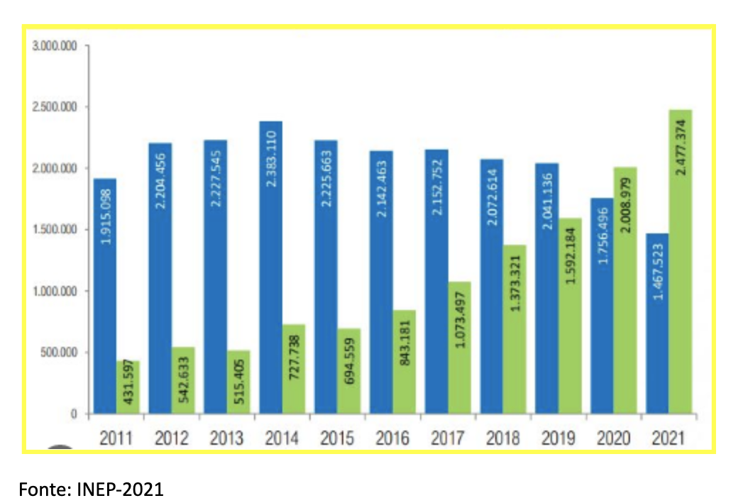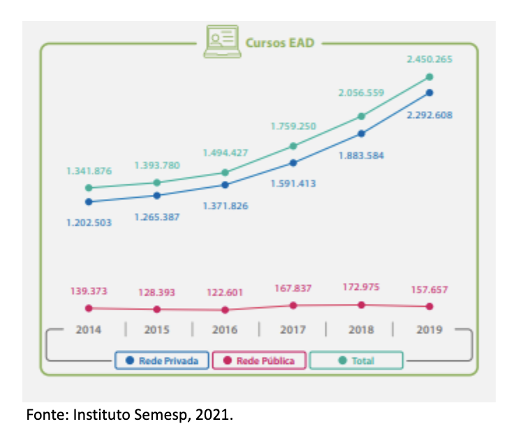 Diante da demanda impulsionada pelo Ministério da Educação, destacada na Meta 12 do Plano Nacional de Educação, instituído pela Lei nº 13.005/2014, quer seja, “(e)levar a taxa bruta de matrícula na educação superior para 50% e a taxa líquida para 33% da população de 18 a 24 anos”. Considerando também que os dados apresentados no Censo da Educação a Distância no Brasil, elaborado pela Associação Brasileira de Educação a Distância (ABED, 2020), apontaram que o ensino a distância tem sido um grande impulsionador do aumento da oferta de vagas no ensino superior, respondendo por mais de 63% das mais de 16,4 milhões de vagas para o ano de 2019, e ainda, considerando os dados apresentados sobre o crescimento da EaD no Brasil, de acordo com o documento Cenário do Ensino Superior no Brasil/SEMESP, Edição 2021, cuja evolução das matrículas podem ser observadas na figura abaixo: