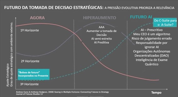Simbiose Homem-Máquina: O segundo horizonte é caracterizado pela hiper-augmentação, em que decisões preditivas são combinadas com a inteligência humana AAA para criar uma parceria simbiótica homem-máquina. Nessa realidade, algoritmos inteligentes trabalham em conjunto com humanos para tomar decisões mais precisas e eficientes.