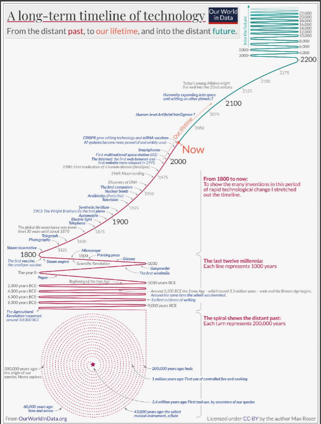 Uma das percepções que podemos extrair dessa perspectiva de longo prazo é o quão extraordinário é o tempo em que vivemos. A mudança tecnológica era extremamente lenta no passado – as tecnologias com as quais nossos ancestrais cresceram ainda eram essenciais em suas vidas quando envelheceram. Em contraste absoluto com aqueles dias, vivemos em uma época de mudanças tecnológicas extraordinariamente rápidas. Para as gerações recentes, tornou-se comum que tecnologias inimagináveis durante a juventude se tornassem realidade durante a vida.