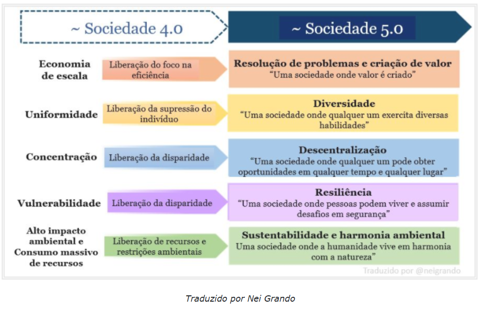 Nela, espera-se que qualquer produto ou serviço seja entregue de maneira ideal às pessoas e adaptado às suas necessidades. Ao mesmo tempo, a Sociedade 5.0 ajudará a superar desafios sociais crônicos, como envelhecimento da população, polarização social, despovoamento e restrições relacionadas à energia e ao meio ambiente. Parece uma tanta utopia, quando ainda se vê fome e falta de esgoto, então para isso é preciso mais que esperança, ou sonho, mas mudança de mentalidade e ação, preferencialmente de forma ampla e colaborativa.