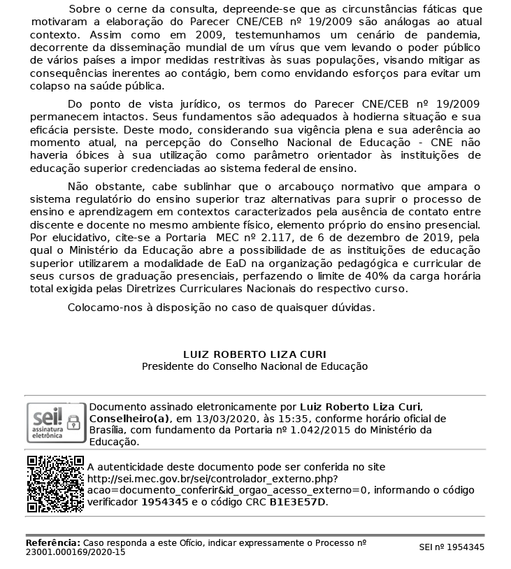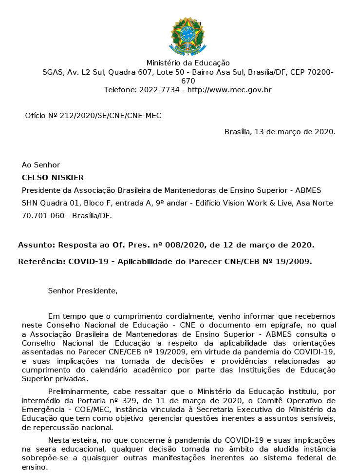 Em resposta à consulta realizada pela Associação Brasileira de Mantenedoras de Ensino Superior (ABMES), no dia 12 de março de 2020, a respeito da aplicabilidade de orientações às instituições de ensino superior, o Conselho Nacional de Educação (CNE) se posicionou em virtude da pandemia do COVID-19 (Coronavírus) e suas implicações na tomada de decisões e providências relacionadas ao cumprimento do calendário acadêmico.
