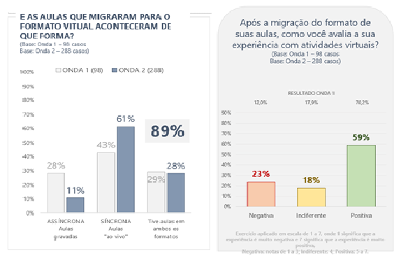 “Temos aí um feedback muito importante dos alunos, com uma grande aceitação positiva do formato adotado pelas instituições para a continuidade das atividades presenciais em ambiente virtual, que na soma representa 77%. Outra informação valiosa apresentada pelo levantamento é que 89% das instituições estão utilizando ferramentas síncronas para a transmissão do conteúdo, mostrando a versatilidade e rapidez na adaptação à realidade imposta às instituições pela pandemia”, explica o diretor presidente da ABMES, Celso Niskier.