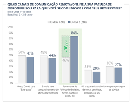Em um questionário de múltiplas escolhas, os estudantes indicaram os principais canais de comunicação com os professores utilizados pelas instituições de ensino superior. O uso de aplicativos de webconferência, como Skype, Hangout, Zoom etc, foi apontado pela grande maioria dos estudantes (84%). Em segundo lugar, com 47%, aparece a utilização de ferramentas de “bate-papo”, os chamados chats. Em seguida, os estudantes indicaram ainda a utilização de e-mails para o compartilhamento de atividades e exercícios (44%), fóruns para postagens de dúvidas (27%) e por último, fóruns para discussão de temas genéricos sobre o curso, com 20%.