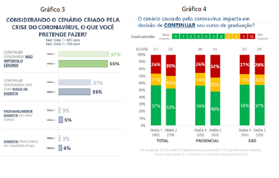 Assim como na primeira etapa do levantamento, mais de 90% dos alunos disseram querer dar continuidade aos estudos, apesar da pandemia. Somente 9% dos estudantes indicaram a intenção de desistir dos estudos, seja pelo curso escolhido ou pelo cenário provocado pelo novo coronavírus, conforme o gráfico 3. Quando perguntados sobre os impactos causados pela pandemia em sua vida acadêmica, 52% dos entrevistados avaliaram que a pandemia teve baixo impacto. Para 18% os efeitos foram médios, contra 30% que disseram ter sofrido alto impacto. Veja o detalhamento entre os estudantes das modalidades presencial e EAD no gráfico 4.