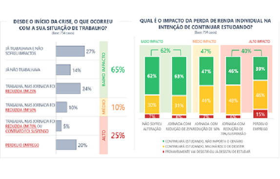 Como esperado, o fechamento de empresas e comércios em função do isolamento social imposto pela Covid-19 afetou o rendimento de parte dos alunos. Quando perguntados sobre este tema, 65% afirmaram não ter sofrido impactos significativos com a pandemia. No entanto, 20% informaram ter perdido o emprego em função da crise. O índice de demissões relatadas foi alto, porém, mesmo assim, somente 15% deste total informou que pretende deixar ou já deixou o curso.