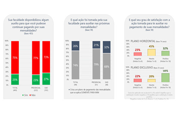 Quando perguntados quanto ao grau de satisfação dos alunos com as condições de auxílio ofertadas pelas instituições, 58% dos estudantes que receberam auxílio exclusivo avaliaram positivamente a medida. Já entre os estudantes que foram atendidos pelos programas de auxílio coletivos, os chamados planos horizontais, o grau de satisfação foi de 32%.