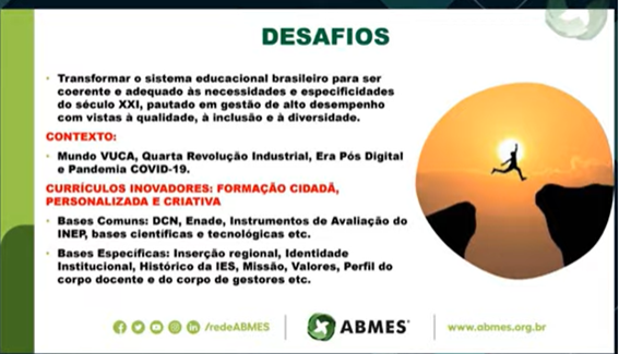 Fechando o talk-show, a vice-presidente da ABMES, Débora Guerra, centrou sua fala na importância do posicionamento de lideranças dos mantenedores e gestores educacionais. “Ainda estamos reativos diante de cada situação que nos é imposta. Se nós (educação particular) somos protagonistas da educação brasileira, a gente tem que estar disposto a discutir as políticas públicas e a educação para o século 21”, declarou.