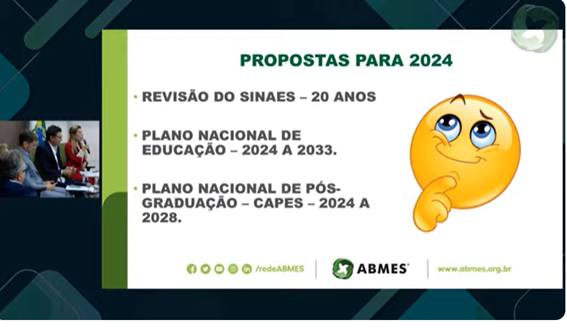 A professora Iara de Xavier fez um panorama histórico sobre as mudanças recentes na educação e no cenário da educação particular. Ela focou sua fala em sua avaliação sobre os processos regulatórios. “O sistema como é hoje cria barreira para criatividade e para inovação, dois aspectos essenciais para evolução da educação”, avaliou. Iara também compartilhou sua análise para o ano de 2024. “Será um ótimo ano, com a revisão do Sinaes, o novo Plano Nacional de Educação e o novo plano para as pós-graduações”, listou.
