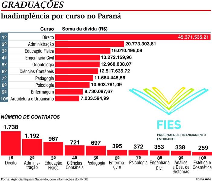 Cerca de 12 mil contratos do Fies (Fundo de Financiamento Estudantil) no Paraná estão com pagamentos em atraso, totalizando um rombo de mais de R$ 260 milhões, segundo informações do programa divulgadas pela agência de dados Fiquem Sabendo.