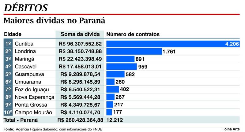 Curitiba tem o maior número de contratos com pagamentos em atraso: 4,2 mil. O maior passivo do estado está nos cursos de Direito da capital: o débito ultrapassa R$ 17 milhões. O curso tem os maiores saldos devedores também em Londrina, Cascavel, Maringá e Foz do Iguaçu.