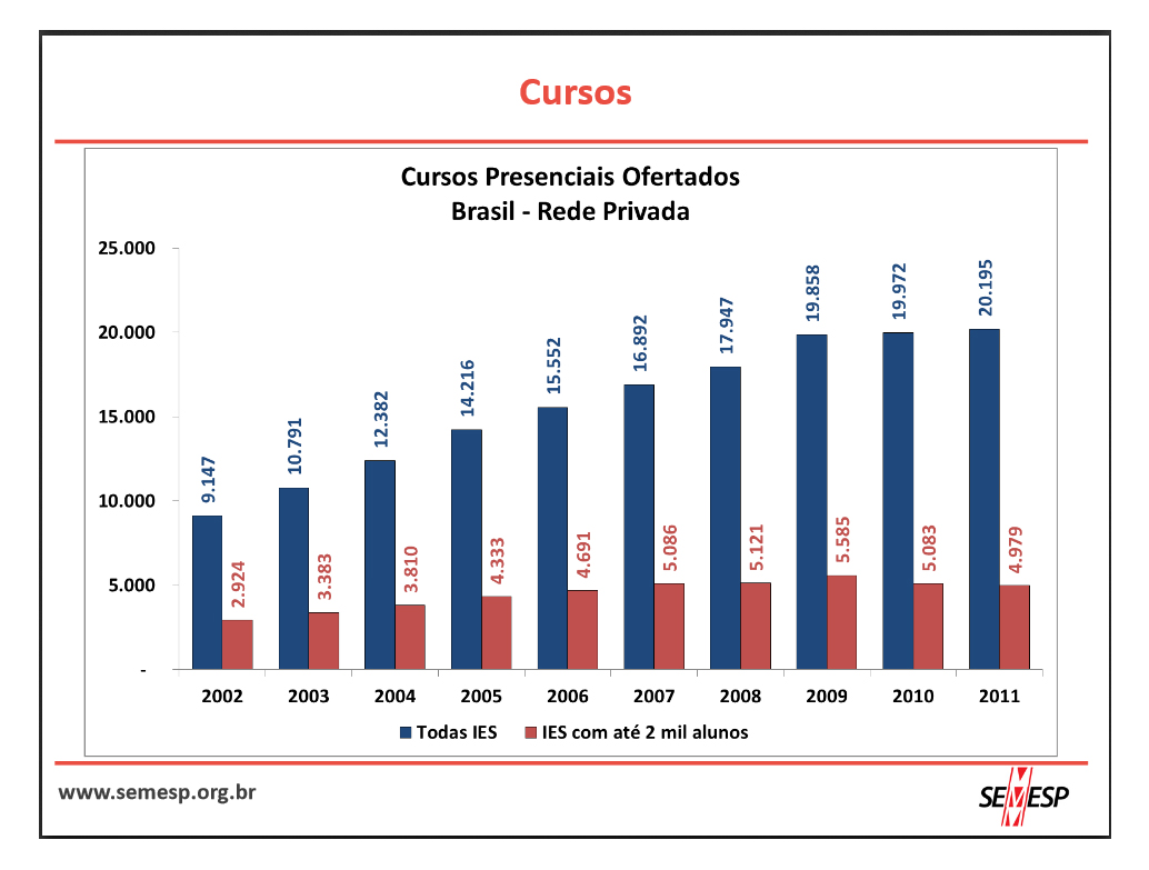 Se por um lado a EaD cresce nas grandes instituições, conseguir autorização para ofertar cursos presenciais continua sendo um gargalo para as PMIES. Os números do Semesp mostram que o setor privado teve uma evolução nos últimos anos, totalizando mais de 20 mil cursos presenciais em 2011. Dado que decresce em relação às pequenas instituições, com queda de 2% em relação a 2010. Rodrigo Capelato garante que essa tendência negativa se dá pela morosidade do processo de regulação por parte do MEC.