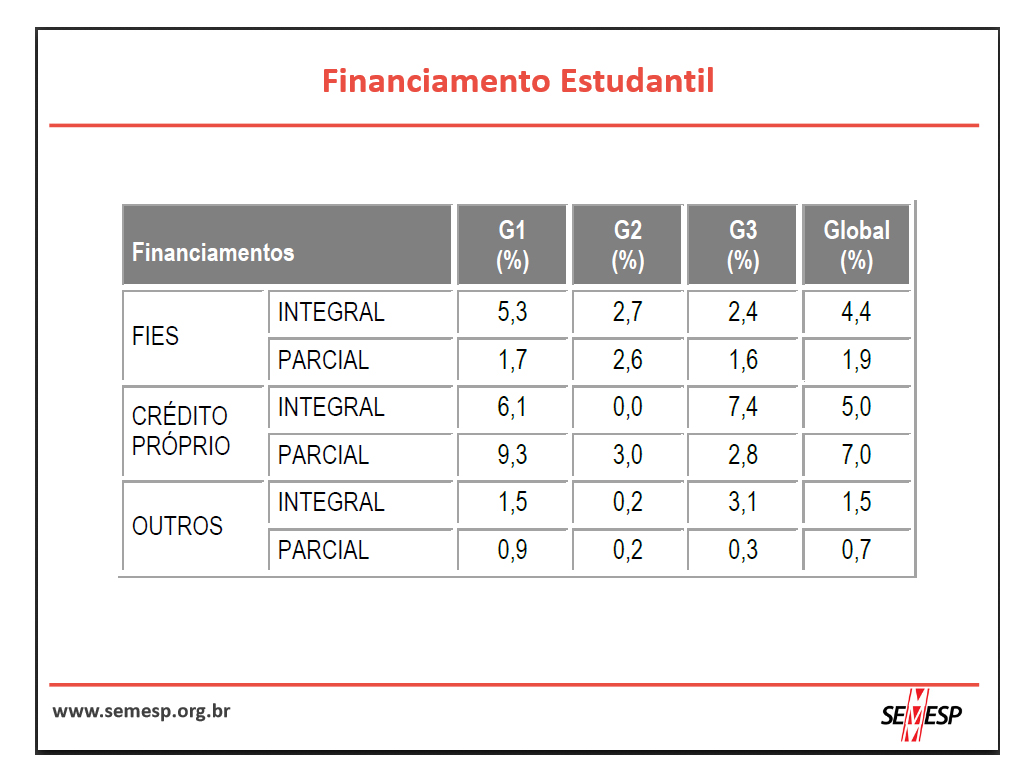 Quanto ao percentual de alunos, a quantidade de matrículas no ensino superior tem crescido consideravelmente em razão do financiamento estudantil. Os números do Semesp apontam que, em 2012, estes estudantes representaram um percentual de 23,8% do total de ingressantes. Na opinião de Capelato, esse dado é uma oportunidade para as PMIES. No entanto, algumas dificuldades impedem que essas instituições possam indicar alunos para o Financiamento Estudantil do governo, o Fies. Uma delas é obter, no mínimo, a nota 3 no Exame Nacional de Desempenho de Estudantes (Enade). Sendo assim, uma das soluções que as pequenas instituições encontram é oferecer crédito próprio.