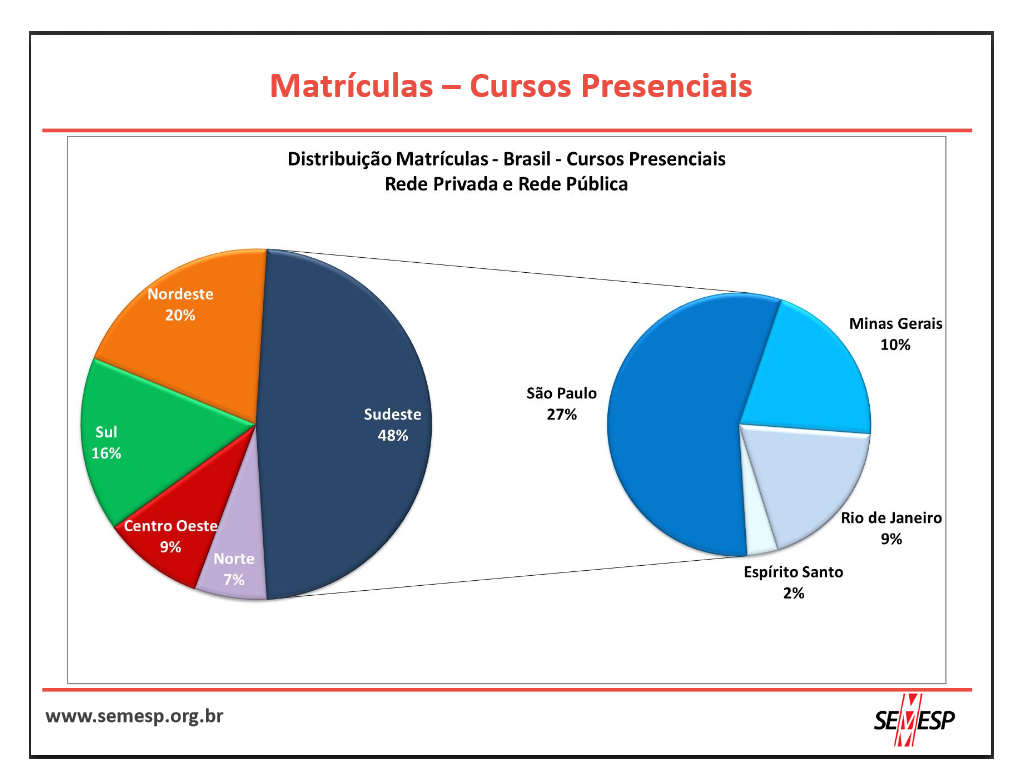 Quase metade dessas instituições está localizada na região sudeste, que concentra 46% das matrículas em cursos presenciais de todo o país. O estado de São Paulo tem quantidade significativa desse percentual, como podemos ver no gráfico a seguir.