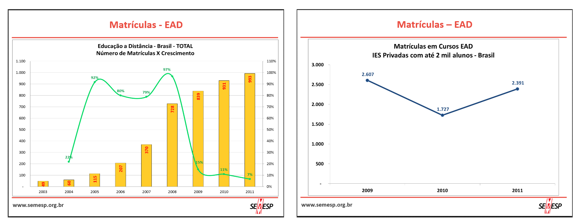 Outra modalidade que representa um crescimento vertiginoso atualmente é a Educação a Distância. Em 2003 as matrículas giravam em tornode 49 mil em todo Brasil. Em 2011 esse número saltou para um milhão, o que representa um crescimento de 97% do setor. Desse total, as PMIES detêm apenas 2.391 matrículas.