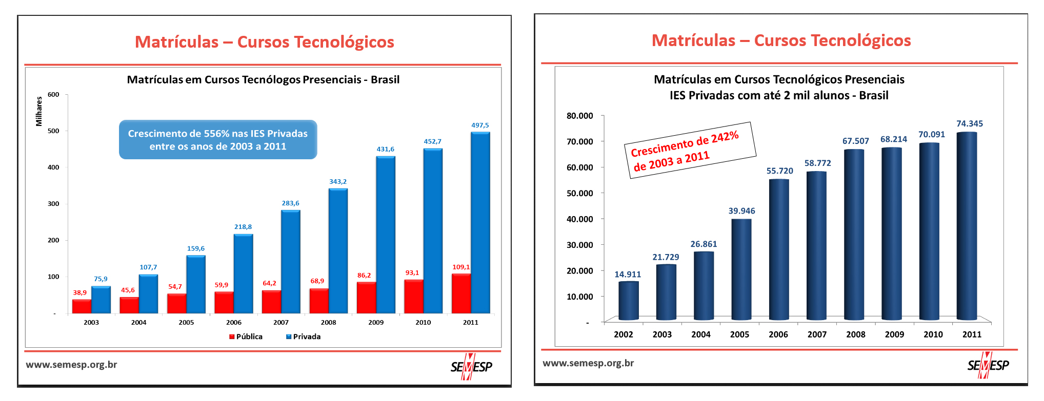 O estudo aponta ainda que o setor particular de ensino superior teve grande parte da expansão nos últimos anos em razão da procura por cursos tecnológicos. De 2002 para cá, as matrículas aumentaram 556%. Esse crescimento não foi tão expressivo entre as IES com até 2.000 alunos quanto nas instituições de grande porte. Entre as pequenas e médias IES, o índice subiu de apenas 242%.