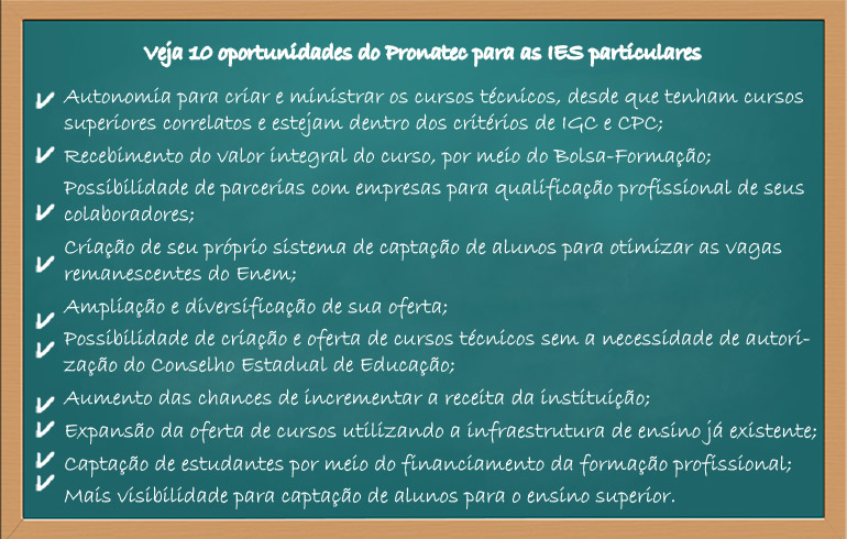 Para atender a crescente demanda do setor produtivo brasileiro, o Governo Federal publicou no dia 5 de junho a Lei nº 12.816 que inclui as Instituições de Ensino Superior Particular no rol de ofertantes do Programa de Acesso ao Ensino Técnico e Emprego (Pronatec). O Programa tem por objetivo aumentar a oferta de cursos de educação profissional e tecnológica e assim suprir o déficit de mão de obra qualificada.